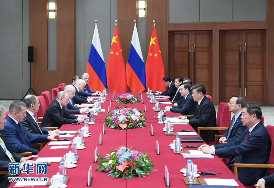 習(xí)近平強(qiáng)調(diào),當(dāng)前國際形勢復(fù)雜深刻演變,中俄雙方都致力于實現(xiàn)各自國家發(fā)展和民族振興,面臨共同的任務(wù)和挑戰(zhàn)。我們要始終將彼此視為重要發(fā)展機(jī)遇,相互支持,相互借力,實現(xiàn)同步振興,攜手構(gòu)建人類命運(yùn)共同體。俄羅斯是共建“一帶一路”倡議重要的合作伙伴。共建“一帶一路”倡議同歐亞經(jīng)濟(jì)聯(lián)盟對接是區(qū)域經(jīng)濟(jì)合作的典范。下階段,雙方要繼續(xù)推進(jìn)經(jīng)貿(mào)、能源、科技、航天、互聯(lián)互通、地方、人文等領(lǐng)域合作。中方將向俄方提供一對大熊貓開展合作研究。
