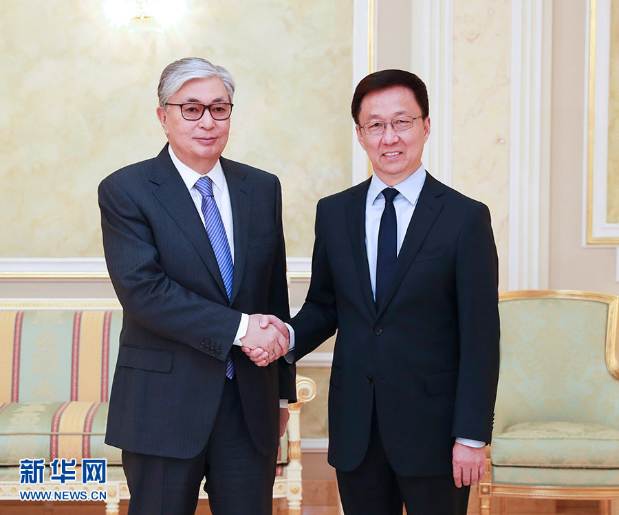 在會見托卡耶夫時,韓正首先轉(zhuǎn)達了習近平主席對托卡耶夫總統(tǒng)的親切問候。韓正說,在兩國元首的戰(zhàn)略引領(lǐng)和親自推動下,中哈全面戰(zhàn)略伙伴關(guān)系快速發(fā)展,雙方政治互信日益加深,各領(lǐng)域合作處于歷史最好水平,在地區(qū)乃至全世界樹立了睦鄰友好、互利共贏的典范。上個月習近平主席同納扎爾巴耶夫首任總統(tǒng)舉行了富有成果的會晤,向他頒授中華人民共和國“友誼勛章”,向國際社會展現(xiàn)了中哈關(guān)系的高水平和特殊性。共建“一帶一路”已成為中哈合作主線,雙方在發(fā)展戰(zhàn)略對接、合作機制建設(shè)、重大項目推進等方面碩果累累。中方愿與哈方一道,繼續(xù)深化絲綢之路經(jīng)濟帶與“光明之路”新經(jīng)濟政策對接,以產(chǎn)能、貿(mào)易、互聯(lián)互通、農(nóng)業(yè)、高技術(shù)、金融合作為優(yōu)先方向,不斷提升中哈合作含金量,更好地造福兩國和兩國人民。中方祝愿哈方順利實施“2050戰(zhàn)略”,在國家發(fā)展事業(yè)中不斷取得新的輝煌成就。