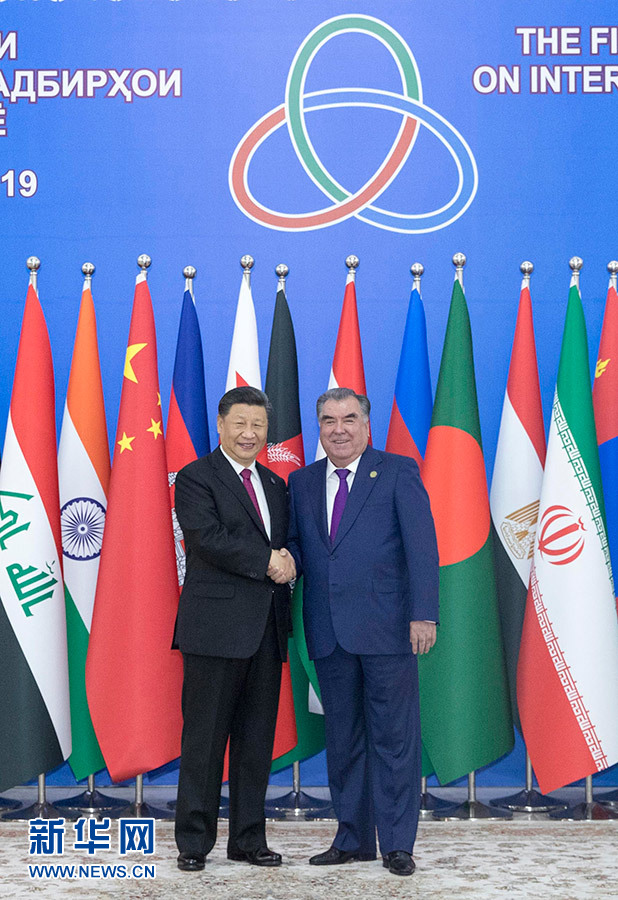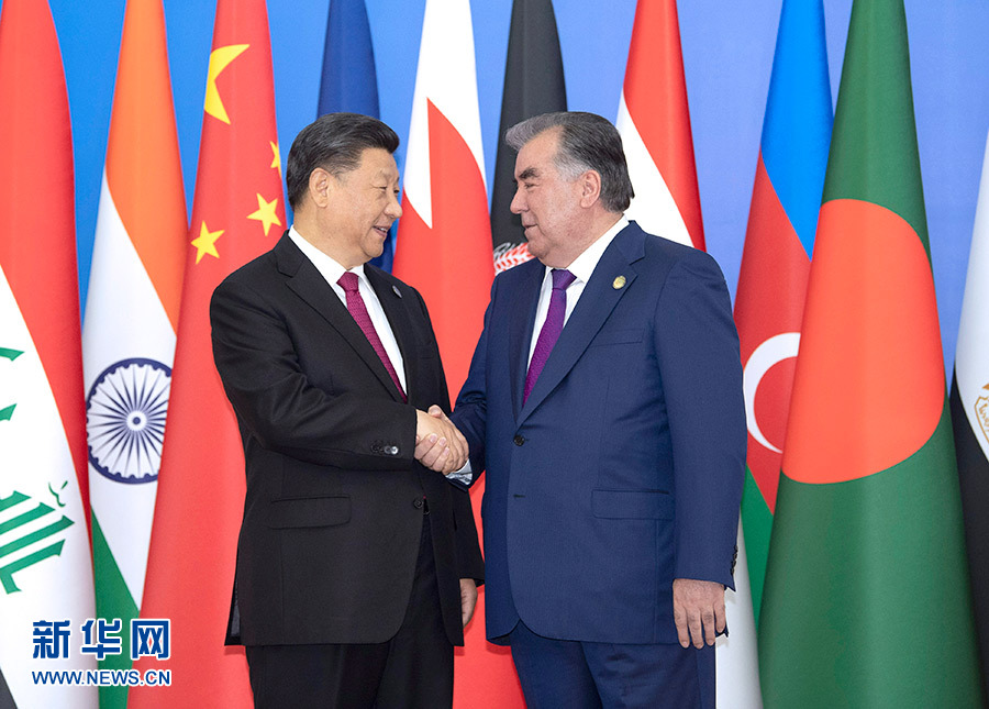 6月15日,亞洲相互協(xié)作與信任措施會(huì)議第五次峰會(huì)在塔吉克斯坦首都杜尚別舉行。國家主席習(xí)近平出席峰會(huì)并發(fā)表重要講話。這是習(xí)近平抵達(dá)納烏魯茲宮迎賓廳,受到塔吉克斯坦總統(tǒng)拉赫蒙熱情迎接。 新華社記者 沙達(dá)提 攝