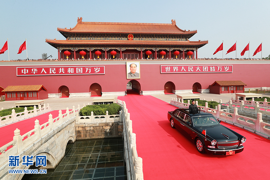 這是習(xí)近平乘坐檢閱車,經(jīng)過金水橋,駛上長安街。 新華社記者 龐興雷 攝