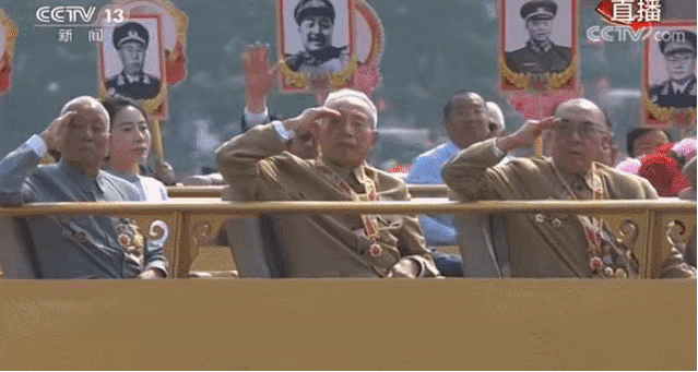 ?一曲《紅旗頌》奏響,當“致敬方陣”的禮賓車上,老一輩黨和國家、軍隊領導人親屬代表,老一輩建設者和親屬代表,新中國成立前參加革命工作的老戰(zhàn)士,老一輩軍隊退役英模、民兵英模和支前模范代表等從天安門前經(jīng)過時,全場所有人自發(fā)起立,向英雄們致以崇高的敬意?! ?