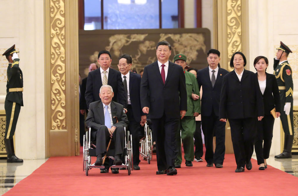 ?萬眾矚目之下,習近平總書記同他們一同步入會場。在雄壯激昂的《向祖國致敬》樂曲聲中,總書記為他們一一頒授勛章獎章,親切握手、表示祝賀。