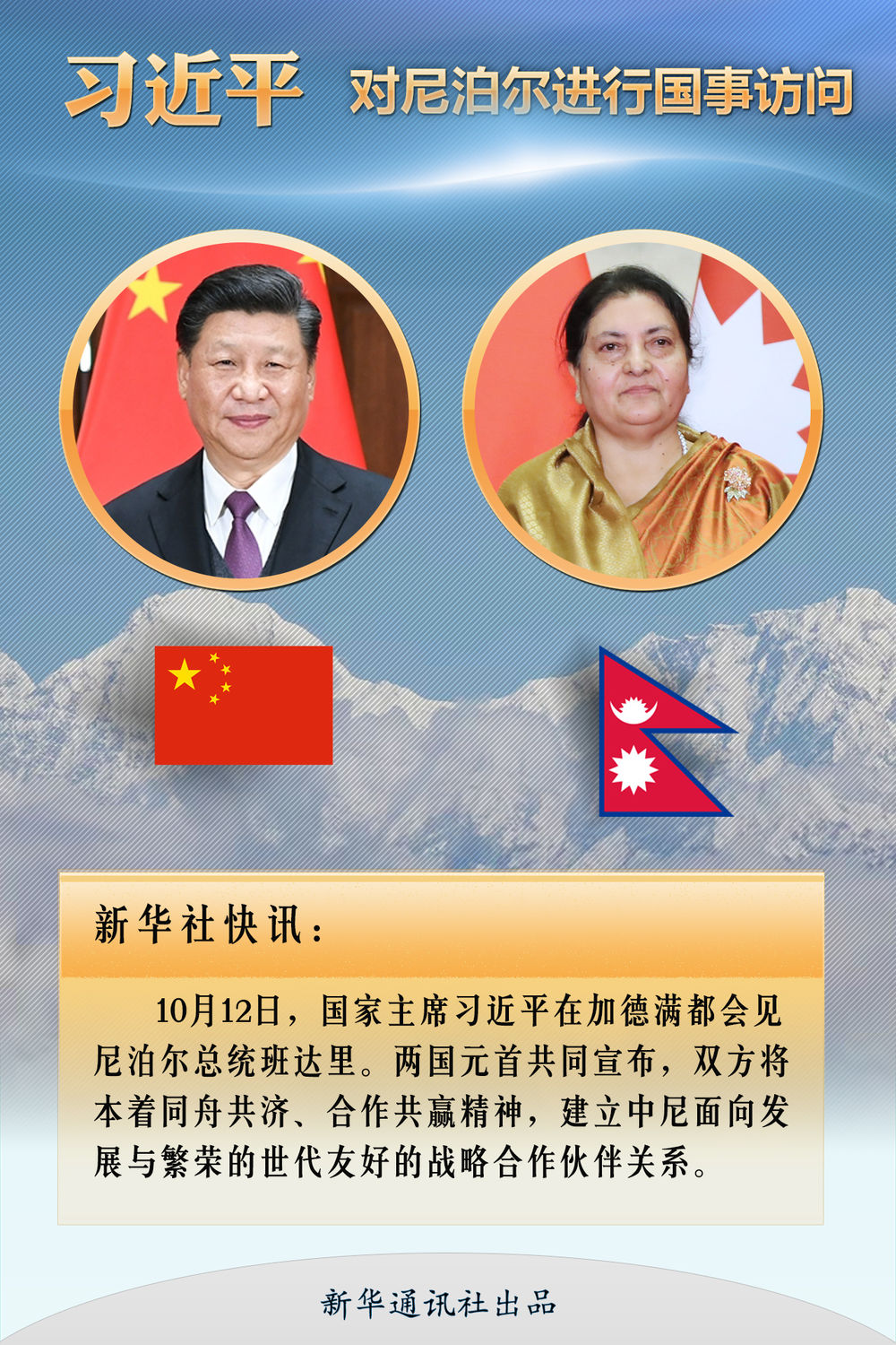 抵尼當(dāng)天,活動(dòng)滿滿當(dāng)當(dāng)。當(dāng)然,最大亮點(diǎn)還是中尼關(guān)系的新定位。當(dāng)天會(huì)見中,習(xí)近平主席同班達(dá)里總統(tǒng)共同宣布,雙方將本著同舟共濟(jì)、合作共贏精神,建立中尼面向發(fā)展與繁榮的世代友好的戰(zhàn)略合作伙伴關(guān)系。