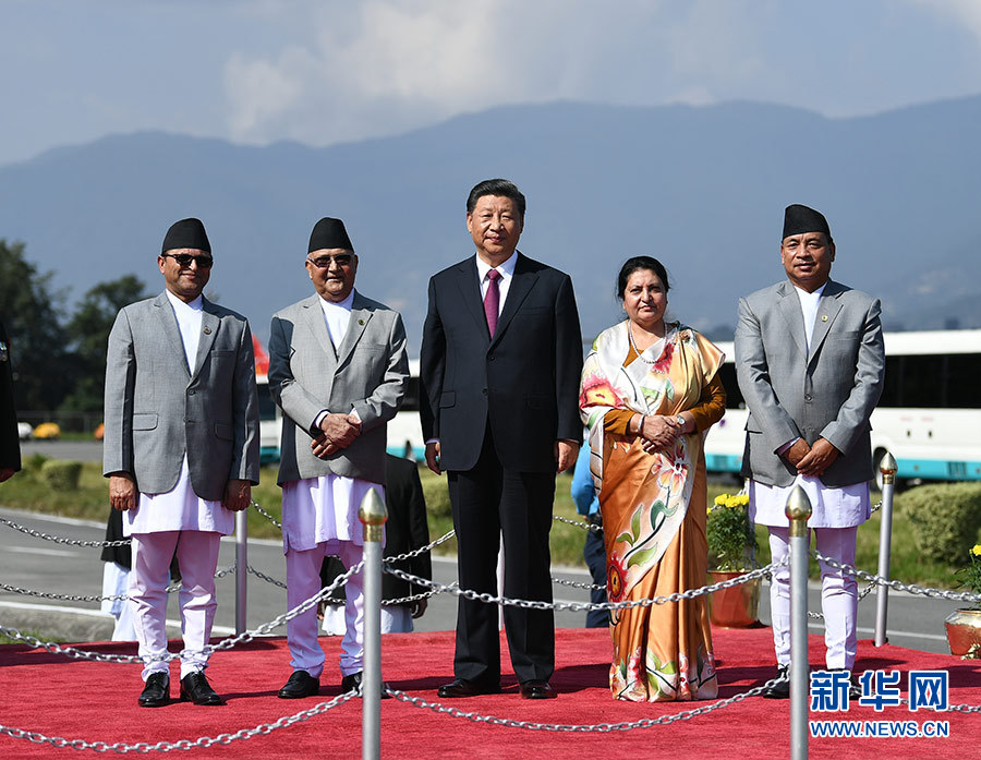班達里在機場為習近平舉行隆重歡送儀式。尼泊爾副總統(tǒng)普恩、總理奧利、聯邦議會聯邦院主席蒂米爾西納、所有內閣成員、軍方高級將領參加。