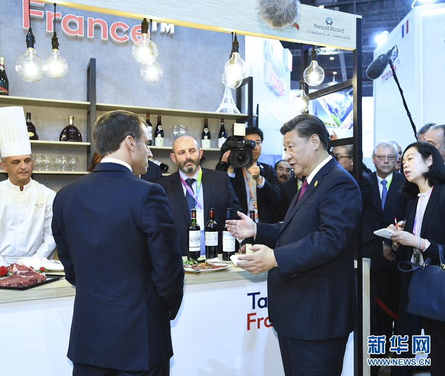 習(xí)近平在法國總統(tǒng)馬克龍陪同下首先來到法國館。馬克龍熱情邀請(qǐng)習(xí)近平品嘗法國紅酒和牛肉食品。在場法國企業(yè)家爭先恐后向習(xí)近平表示,法國企業(yè)看好中國市場,希望進(jìn)一步擴(kuò)大對(duì)華出口。習(xí)近平指出,中國消費(fèi)市場很大,可以滿足不同層次的多樣化需求,希望法國企業(yè)家展現(xiàn)長遠(yuǎn)眼光,同中國加強(qiáng)互利合作。