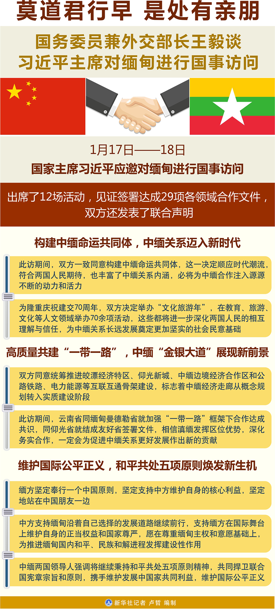 王毅說,習(xí)近平主席新年首訪緬甸,是黨中央著眼外交全局采取的一次重大周邊外交行動,此訪時間雖短,但日程緊湊,成果豐碩。習(xí)近平主席出席了12場活動,見證簽署達(dá)成29項(xiàng)各領(lǐng)域合作文件,雙方還發(fā)表了聯(lián)合聲明。緬方對習(xí)近平主席此訪期待已久,給予最高禮遇隆重接待。緬甸總統(tǒng)溫敏和國務(wù)資政昂山素季聯(lián)袂出席重大活動,緬甸第一、第二副總統(tǒng)及所有內(nèi)閣成員、聯(lián)邦議會兩院議長以及主要政黨負(fù)責(zé)人悉數(shù)出面,陪同習(xí)近平主席出席中緬建交70周年系列慶?;顒郁咧芯捨幕糜文陠觾x式。