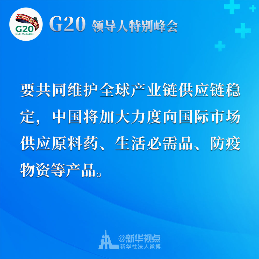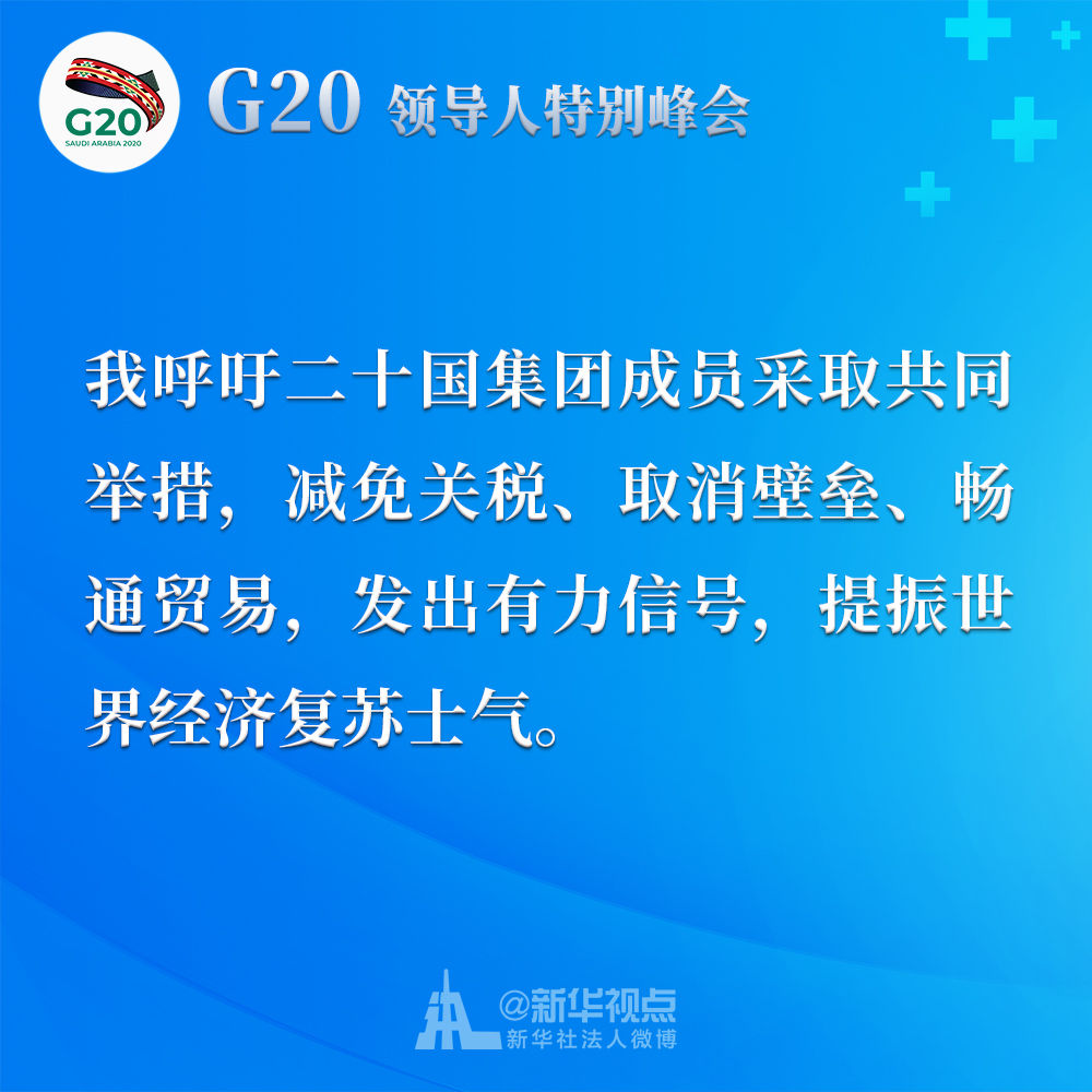 我呼吁二十國集團(tuán)成員采取共同舉措,減免關(guān)稅、取消壁壘、暢通貿(mào)易,發(fā)出有力信號(hào),提振世界經(jīng)濟(jì)復(fù)蘇士氣。我們應(yīng)該制定二十國集團(tuán)行動(dòng)計(jì)劃,并就抗疫宏觀政策協(xié)調(diào)及時(shí)作出必要的機(jī)制性溝通和安排。