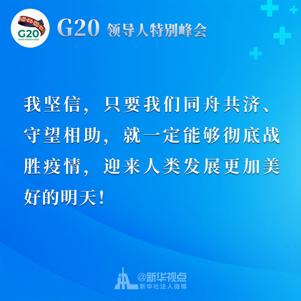 習(xí)近平在二十國集團(tuán)領(lǐng)導(dǎo)人應(yīng)對(duì)新冠肺炎特別峰會(huì)上重要講話金句↓