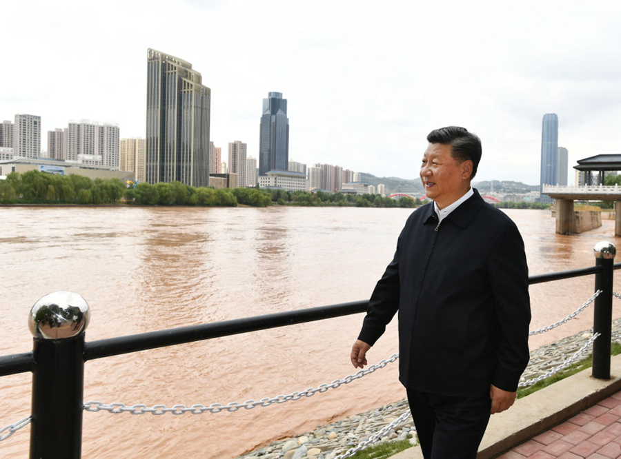 去年8月21日,黃河上游,甘肅。在蘭州黃河治理蘭鐵泵站項(xiàng)目點(diǎn),登上觀景平臺(tái),俯瞰堤壩加固防洪工程,了解黃河治理和生態(tài)保護(hù)情況;