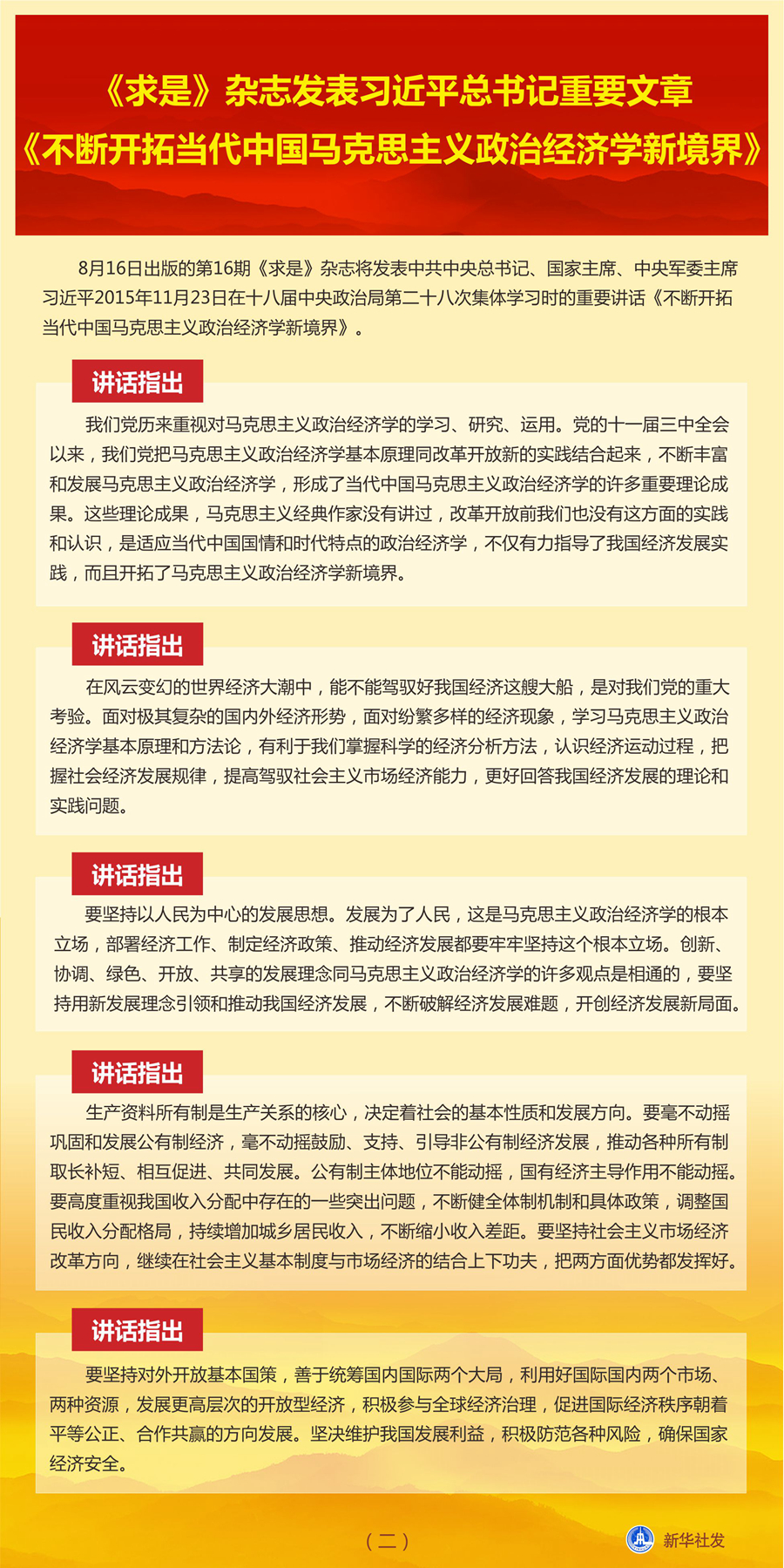 講話指出,要堅(jiān)持以人民為中心的發(fā)展思想。發(fā)展為了人民,這是馬克思主義政治經(jīng)濟(jì)學(xué)的根本立場,部署經(jīng)濟(jì)工作、制定經(jīng)濟(jì)政策、推動經(jīng)濟(jì)發(fā)展都要牢牢堅(jiān)持這個(gè)根本立場。創(chuàng)新、協(xié)調(diào)、綠色、開放、共享的發(fā)展理念同馬克思主義政治經(jīng)濟(jì)學(xué)的許多觀點(diǎn)是相通的,要堅(jiān)持用新發(fā)展理念引領(lǐng)和推動我國經(jīng)濟(jì)發(fā)展,不斷破解經(jīng)濟(jì)發(fā)展難題,開創(chuàng)經(jīng)濟(jì)發(fā)展新局面。
