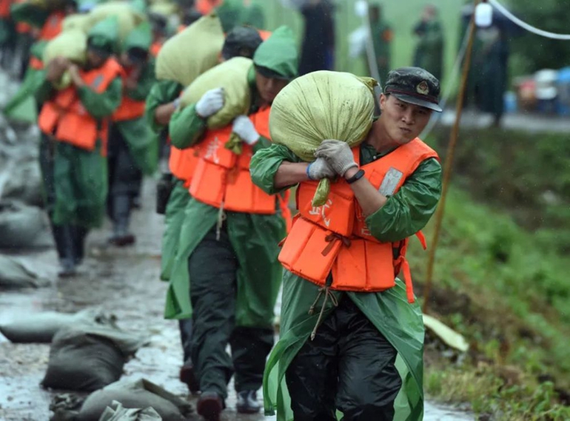 和平年代,面對(duì)波濤洶涌的洪水,解放軍官兵、民兵、消防救援人員緊急搶險(xiǎn)救災(zāi)。老百姓則紛紛走出家門(mén),給搶險(xiǎn)救災(zāi)人員送去食物,送去溫暖: