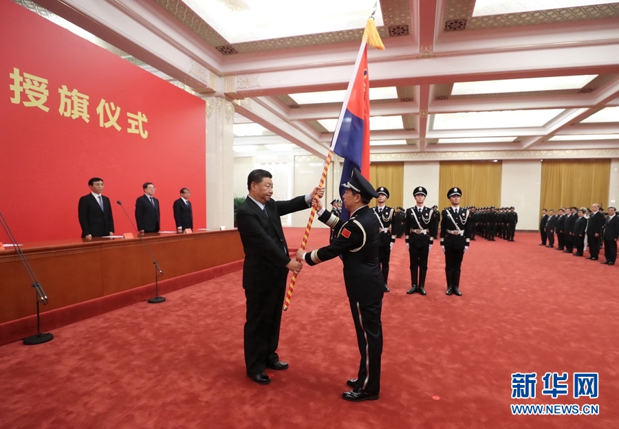 8月26日,中國人民警察警旗授旗儀式在人民大會堂舉行。中共中央總書記、國家主席、中央軍委主席習近平向中國人民警察隊伍授旗并致訓詞。這是習近平向中國人民警察隊伍授旗。 新華社記者 鞠鵬 攝