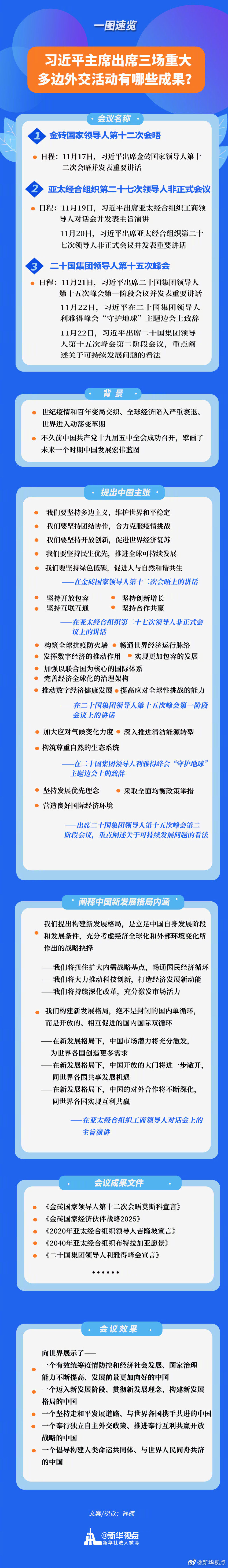 11月17日至22日,國家主席習(xí)近平接連出席金磚國家領(lǐng)導(dǎo)人第十二次會晤、亞太經(jīng)合組織第二十七次領(lǐng)導(dǎo)人非正式會議、二十國集團領(lǐng)導(dǎo)人第十五次峰會三場重大多邊外交活動,并發(fā)表一系列重要講話。習(xí)主席的講話有哪些要點?提出了哪些中國主張?是如何闡釋中國新發(fā)展格局內(nèi)涵的?戳圖速覽↓