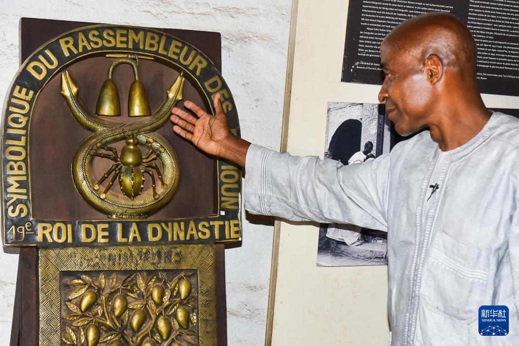 4月12日,在喀麦隆西部大区丰班,巴蒙王宫博物馆向导介绍巴蒙王国的象征。