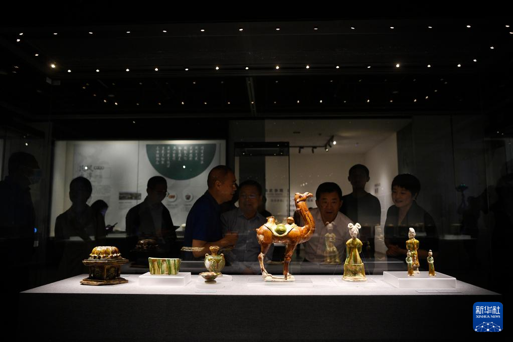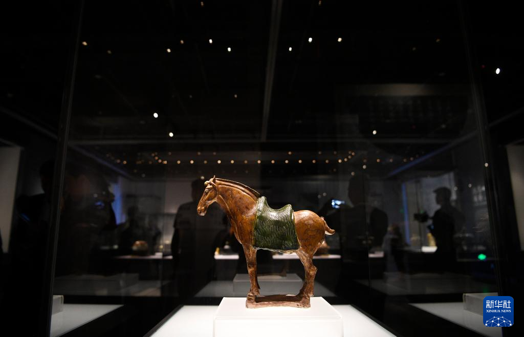 图为西夏博物馆展出的唐三彩披泥障马(5月18日摄)。