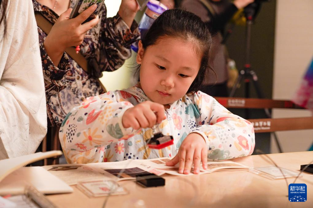 7月14日晚,小朋友在上海博物馆的展厅内收集印章。