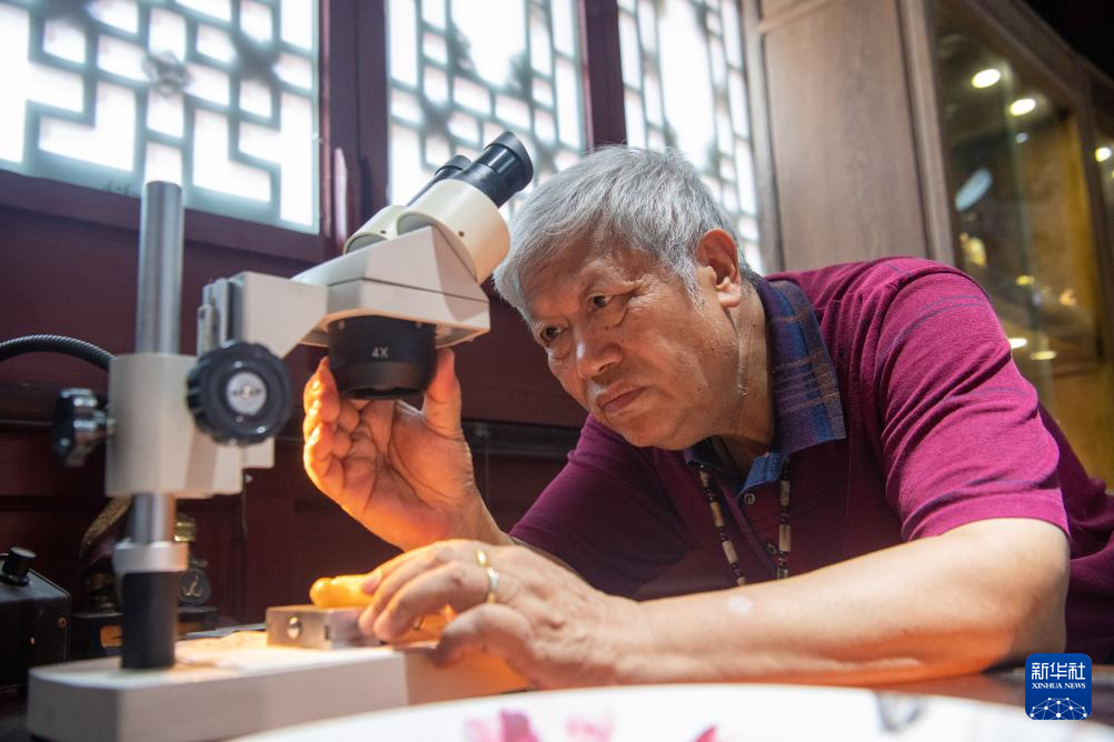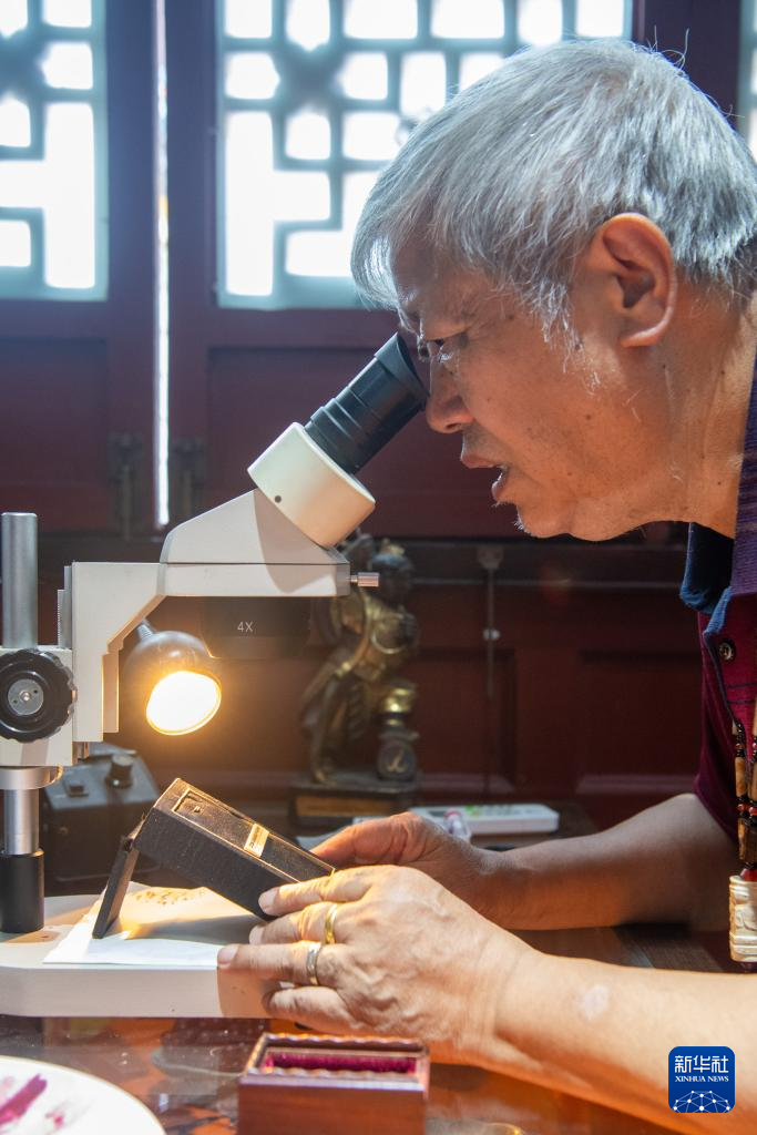7月31日,潘启慧在调整显微镜准备观察微刻作品。