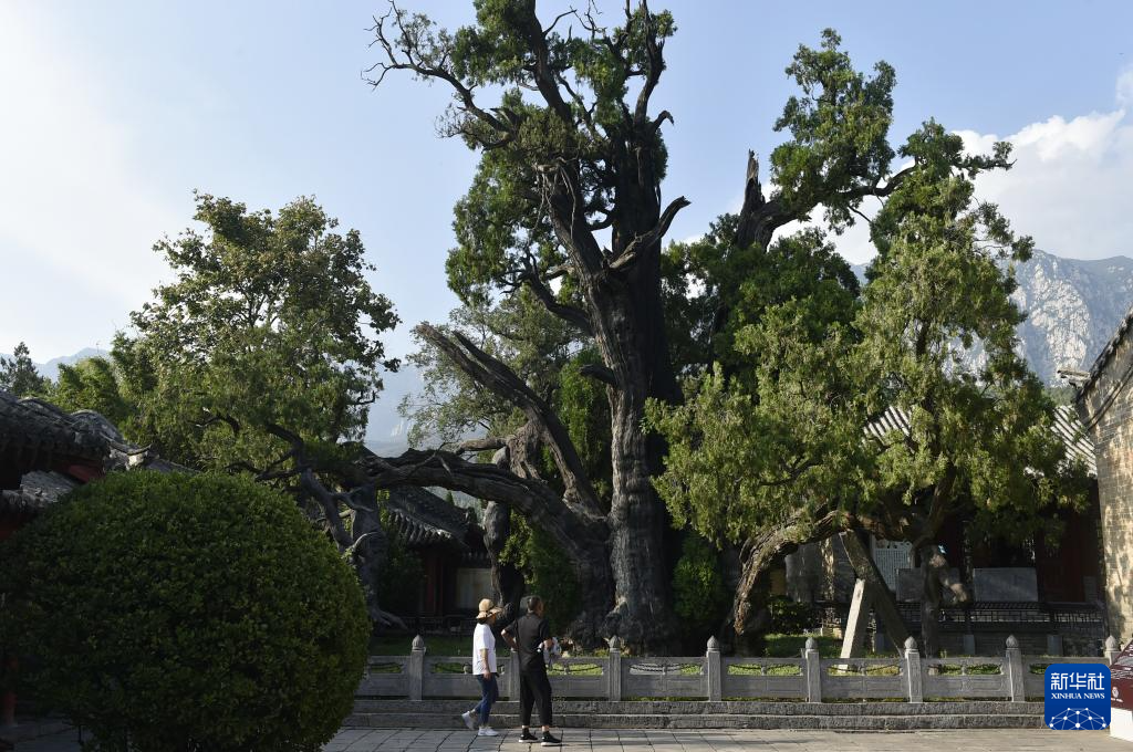 8月7日,游人在嵩阳书院内的“杏坛”参观。