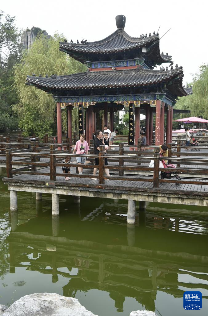 8月19日,身穿古装的工作人员在中国翰园碑林景区与游人互动。