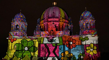 这是10月8日在埃及吉萨省拍摄的晚上亮灯的大埃及博物馆一处入口。