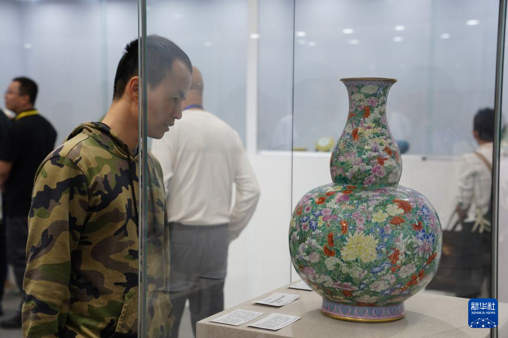 10月18日,参观者在瓷博会现场举办的第六届世界华人收藏家大会瓷器精品展上观赏展品。