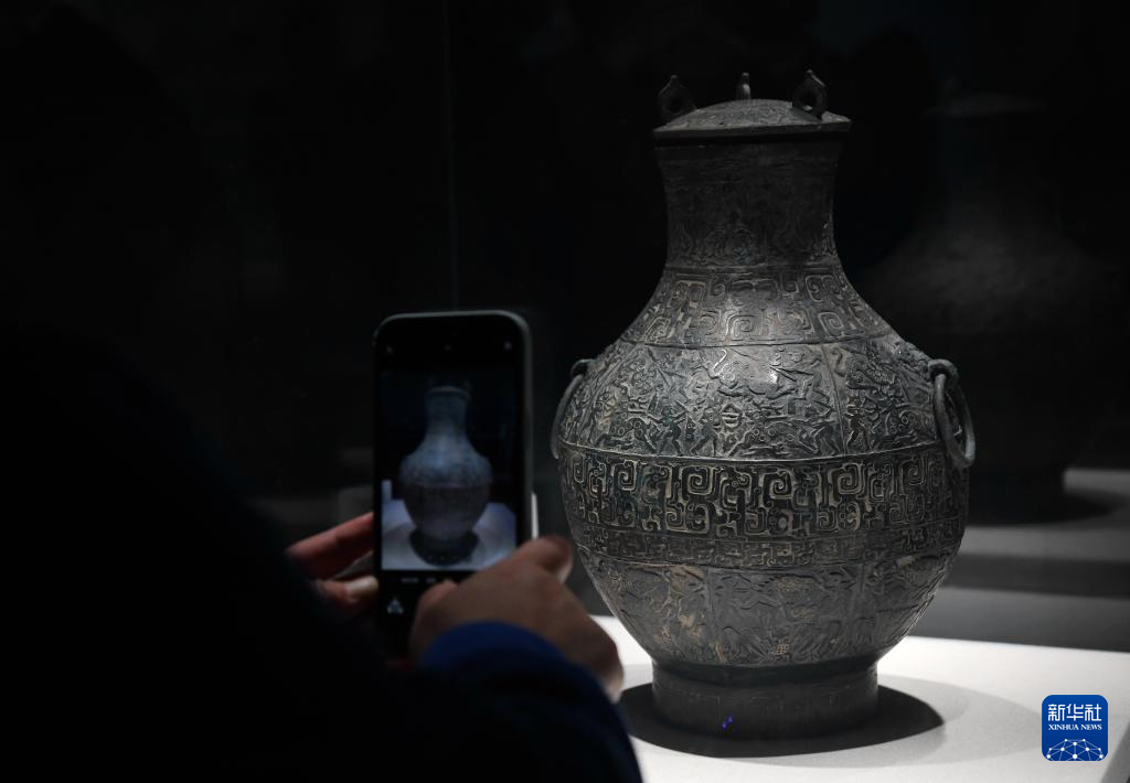 10月25日,观众在秦始皇帝陵博物院观看成都博物馆馆藏文物狩猎纹铜壶。