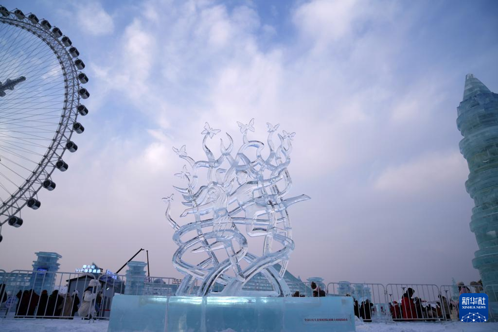 1月4日,在哈尔滨冰雪大世界园区内,游客观赏中国选手参赛冰雕作品《天使的爱》。