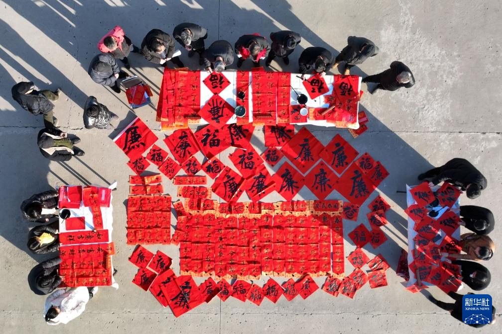 1月28日,书法爱好者在河北省巨鹿县西郭城村书写廉政题材春联(无人机照片)。