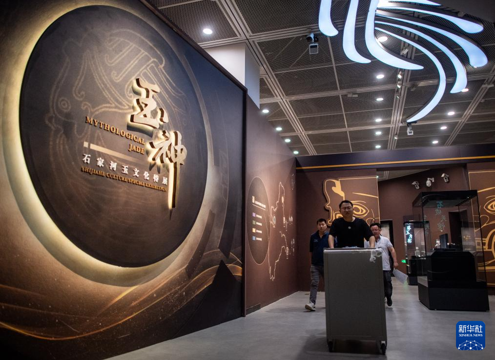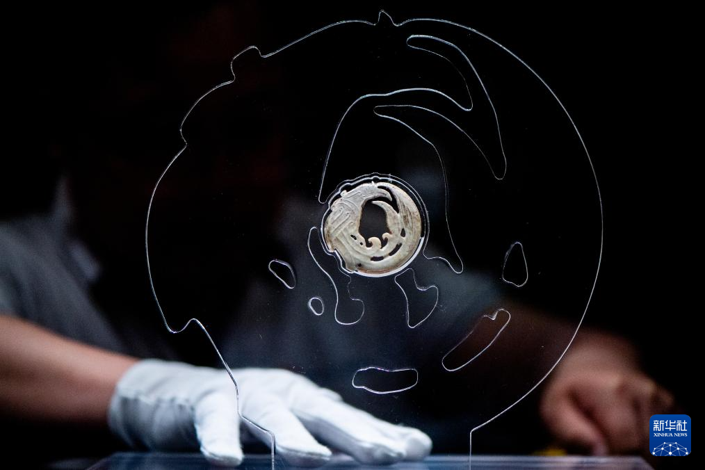 3月30日,工作人员在固定展品玉团凤。为迎接玉团凤,武汉盘龙城遗址博物院在玉团凤展柜上方将灯光布置成玉团凤形状。