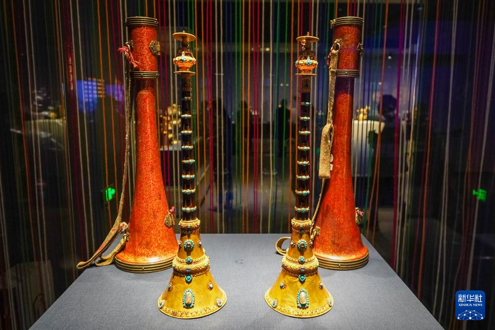 5月11日,“布达拉宫——来自雪域的世界文化遗产”展览现场展出的“藏式唢呐”。