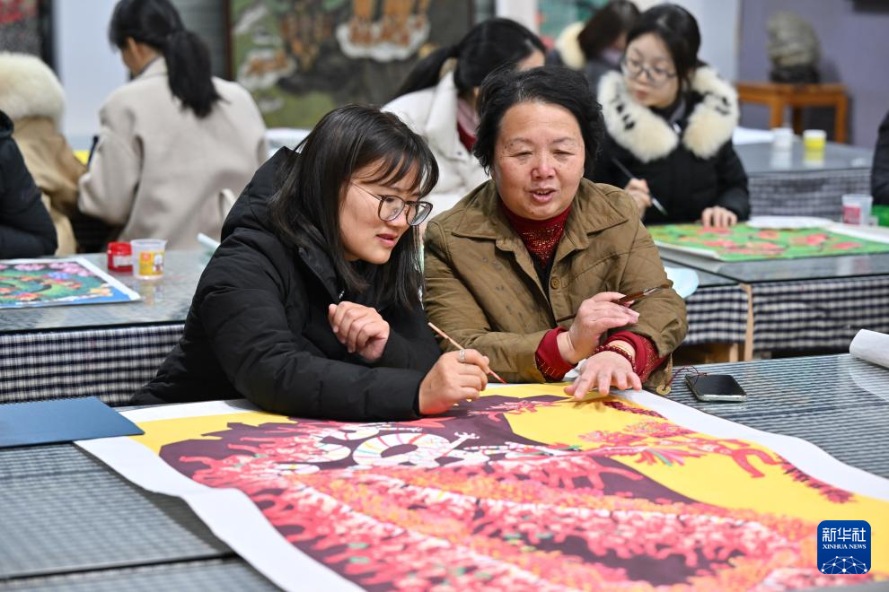 1月10日,漳平市农民画院副院长、“福建农民画”非遗项目省级传承人王秀珍(右)向前来学习农民画的学员传授绘画技艺。