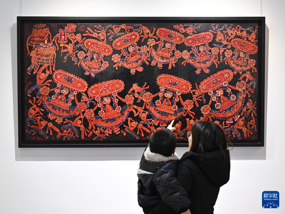 1月10日,农民画爱好者在漳平市农民漆画展厅观摩农民漆画和漆艺展品。