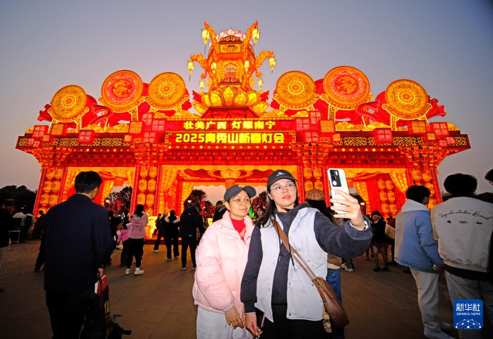 1月18日,游客在广西南宁2025年青秀山新春灯会上自拍。