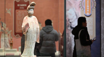 1月21日,参观者在“万古长歌——湖南史前文明图卷展”上观看陶器。