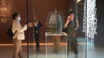 2月26日,游客在西部机场博物馆珍宝馆内参观国家一级文物“秦公镈”。