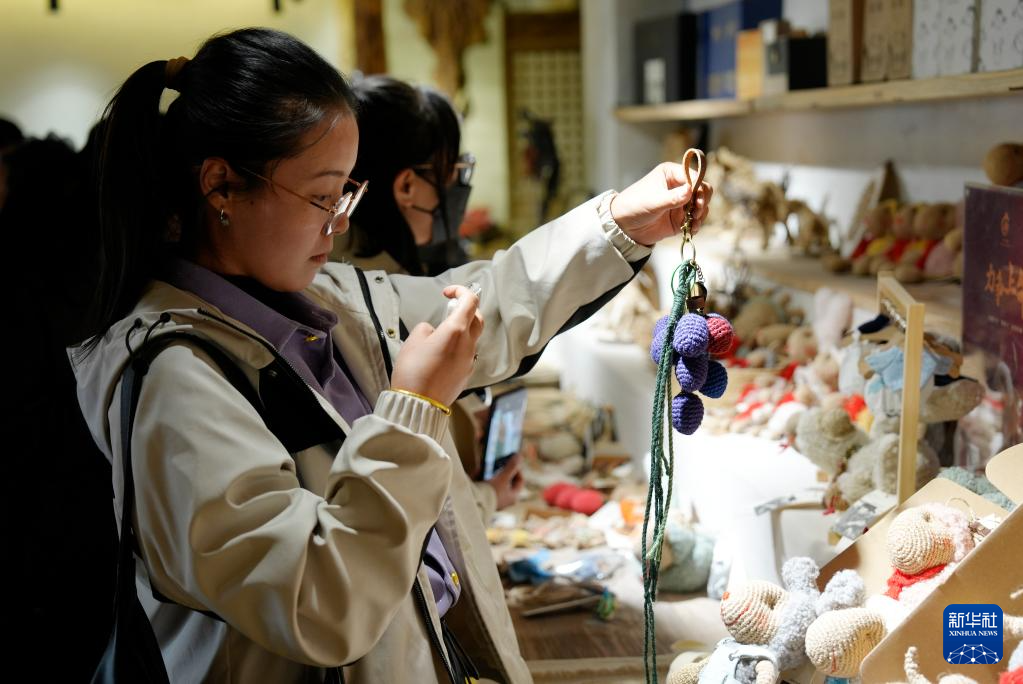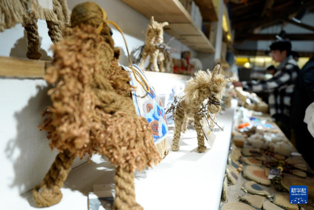 3月26日,参观者在宁夏非遗麻编传承基地选购文创产品。