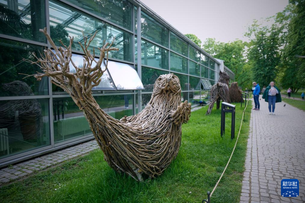 这是5月6日在波兰首都华沙拍摄的海豹树枝雕塑。