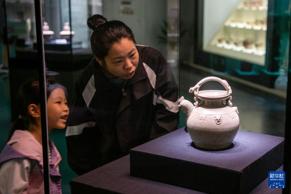 5月18日,小朋友和家长在浙江省余姚博物馆参观西晋越窑青釉黄鼬把瓷鸡首壶。