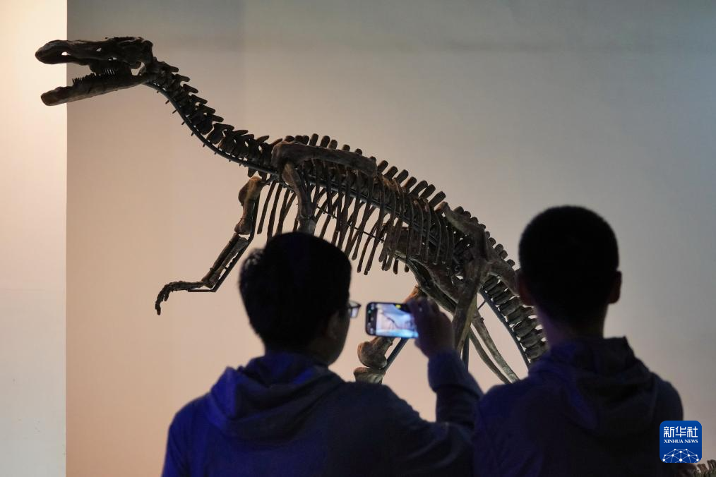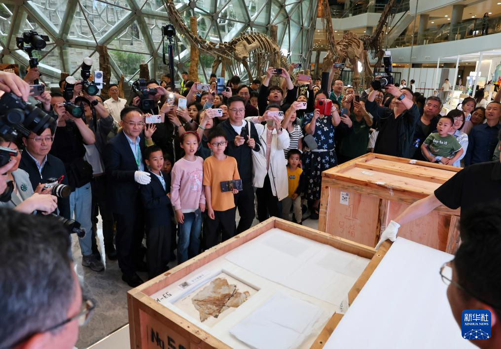 5月18日,在上海自然博物馆举行的“龙吟九州·中国恐龙大展”展品开箱仪式上,参观者观看、拍摄恐龙化石。