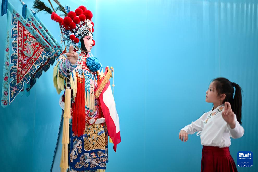 5月18日,小朋友在江苏省昆山戏曲百戏博物馆模仿演员动作。