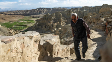 6月28日,张志忠(右)带着学生在寻找烧制瓷器的原料(无人机照片)。