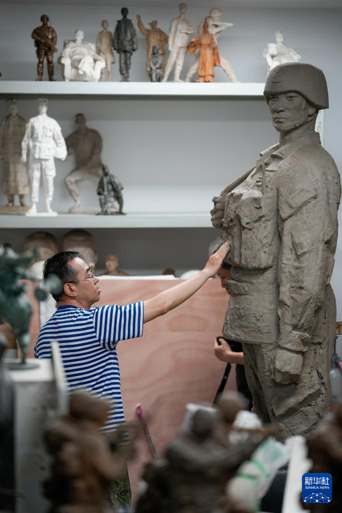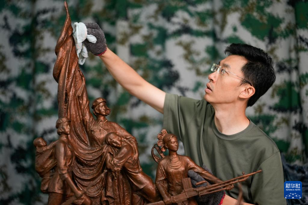 7月17日,解放军文工团雕塑创作员郎钺在擦拭雕塑。