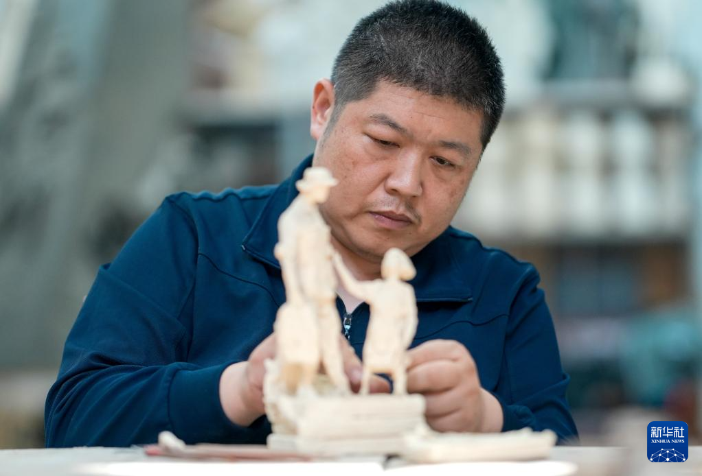 7月17日,解放军文工团雕塑创作员郎钺在进行雕塑创作。