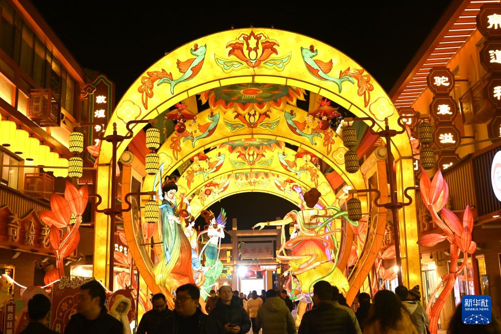 3月1日,人们在甘肃省敦煌夜市举办的敦煌灯会上观赏花灯。