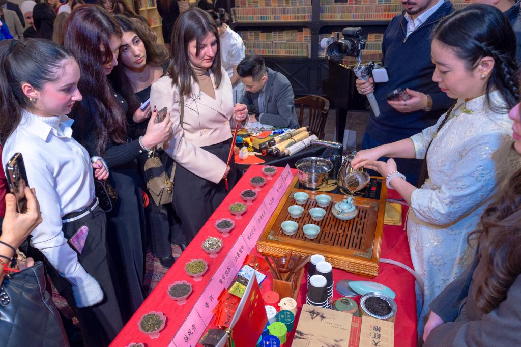 2月11日,在阿塞拜疆巴库图书中心,阿语言大学孔子学院老师向来宾展示中国茶文化。新华社记者陈俊锋摄