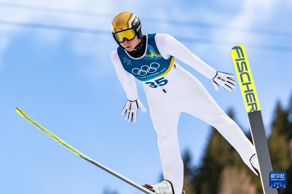 2月17日,挪威选手奥夫特布罗在个人大跳台比赛轮中。