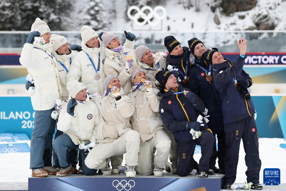 2月17日,冠军法国队(中)、亚军挪威队(左)和季军瑞典队在颁奖仪式上自拍合影。