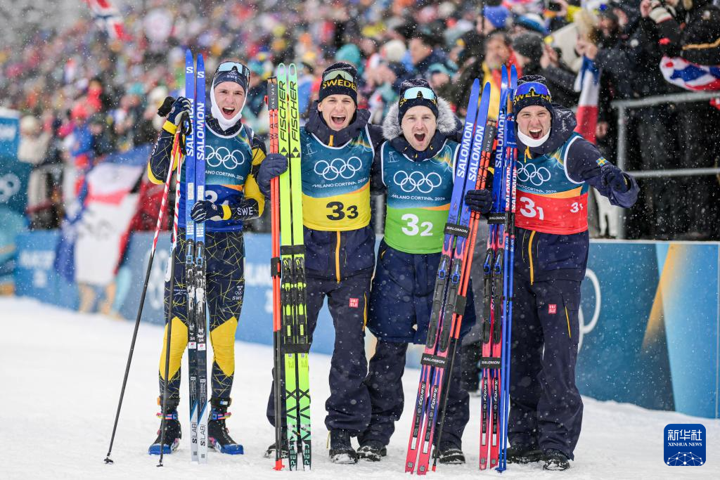 2月17日,季军瑞典队选手塞瓦斯蒂安、马丁·乌尔达尔、内林、布兰特(从左到右)在赛后庆祝。