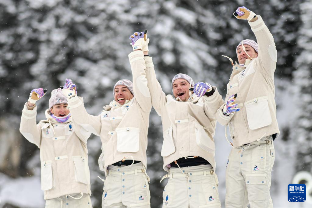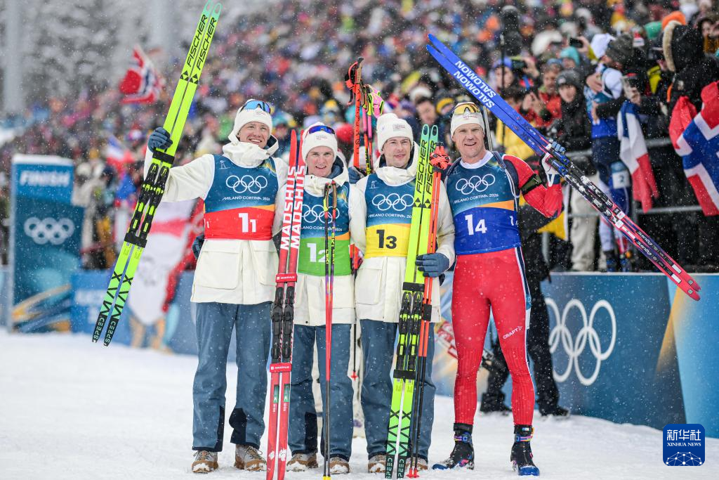 2月17日,亚军挪威队选手马丁·乌尔达尔、博滕、莱格雷德、克里斯蒂安森(从左至右)在赛后庆祝。