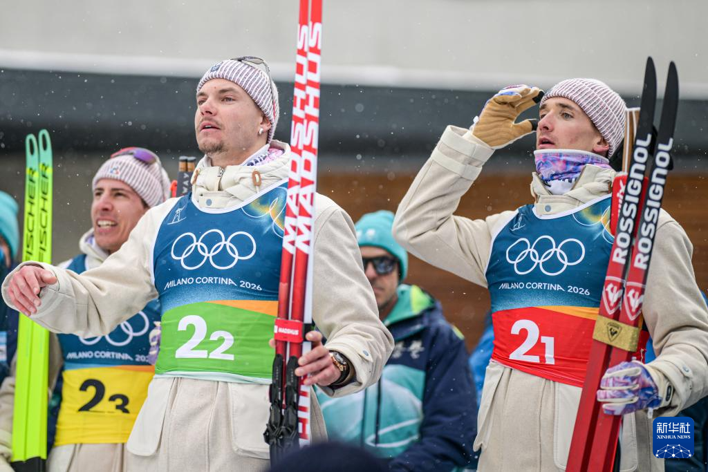 2月17日,法国队选手法比安·克洛德(右)在终点线和队友拥抱。